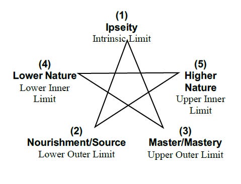 The Being Pentad describes what every living being needs in order to sustain and grow its viability: its unique identity (Ipseity), its source of nourishment and origin (Nourishment/Source), the ends it exists to serve (Master/Mastery), the lower nature it must maintain to remain coherent (Lower Nature), and the higher nature it is always reaching toward (Higher Nature). These are not five separate things. They are five limits that bound both the significance and the potential something can attain.